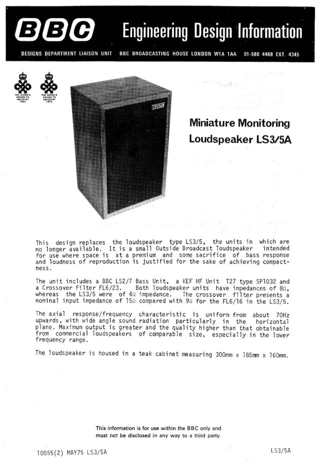 有没有注意到文件里那个“皇冠箭头齿轮”标志,THE QUEEN’S AWARD TO INDUSTRY是当时的英女皇工业贡献奖,特别颁发给对工业有重大贡献的设计,BBC LS3/5与LS3/5A横空出世,历久弥新,跨越半个世纪,绝非徒有虚名。